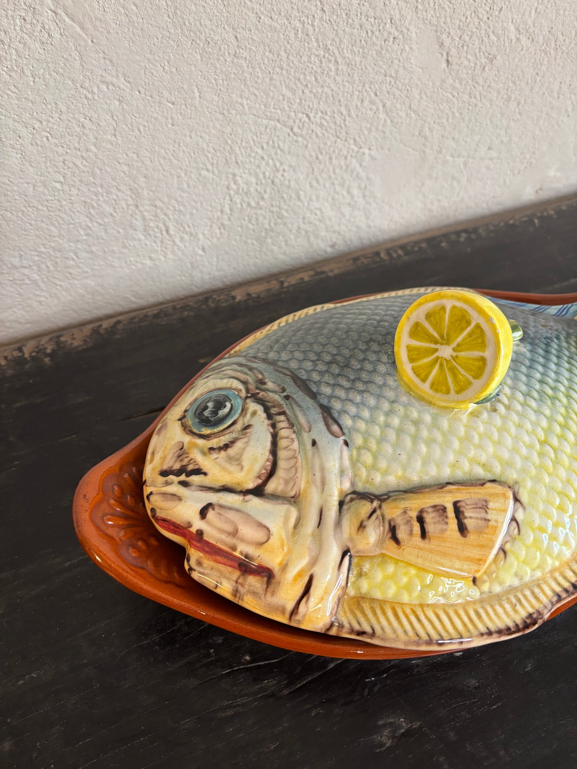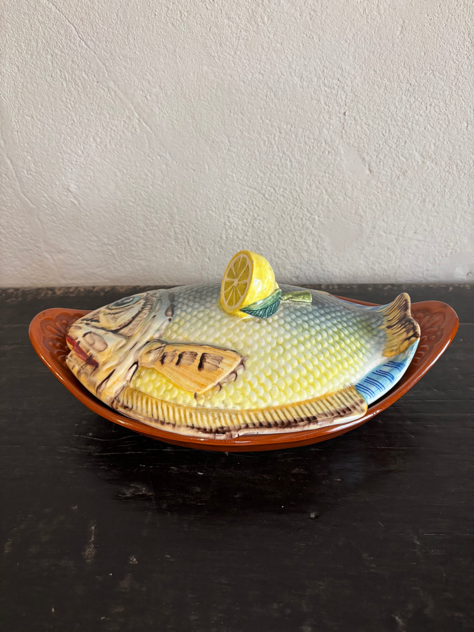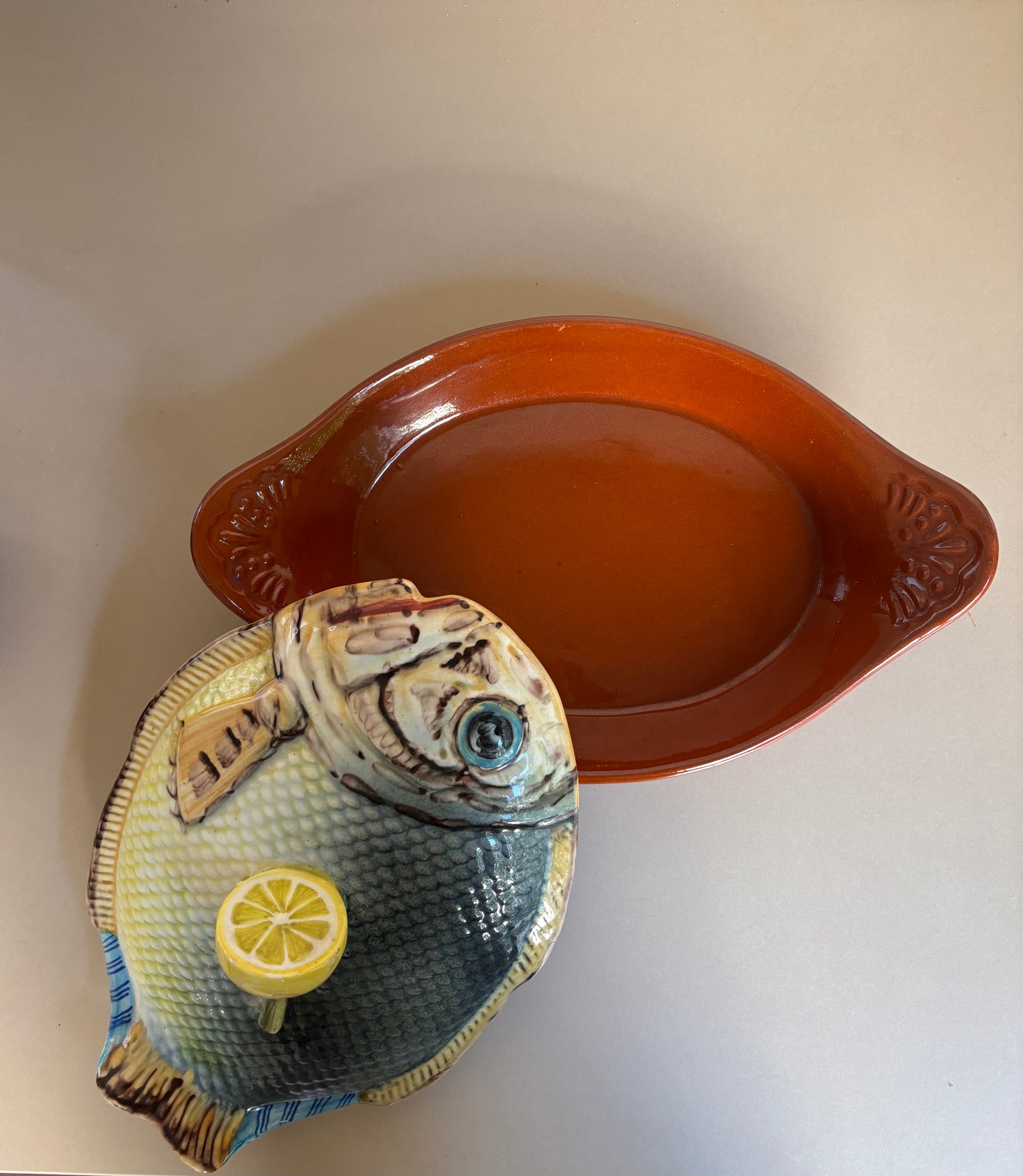 Antigua fuente de Manises (Valencia,España), original de los años 50. La tapa es de cerámica, la fuente de barro cocido vidriado es apto para horno. De la marca Hispania. Numerada en la base.