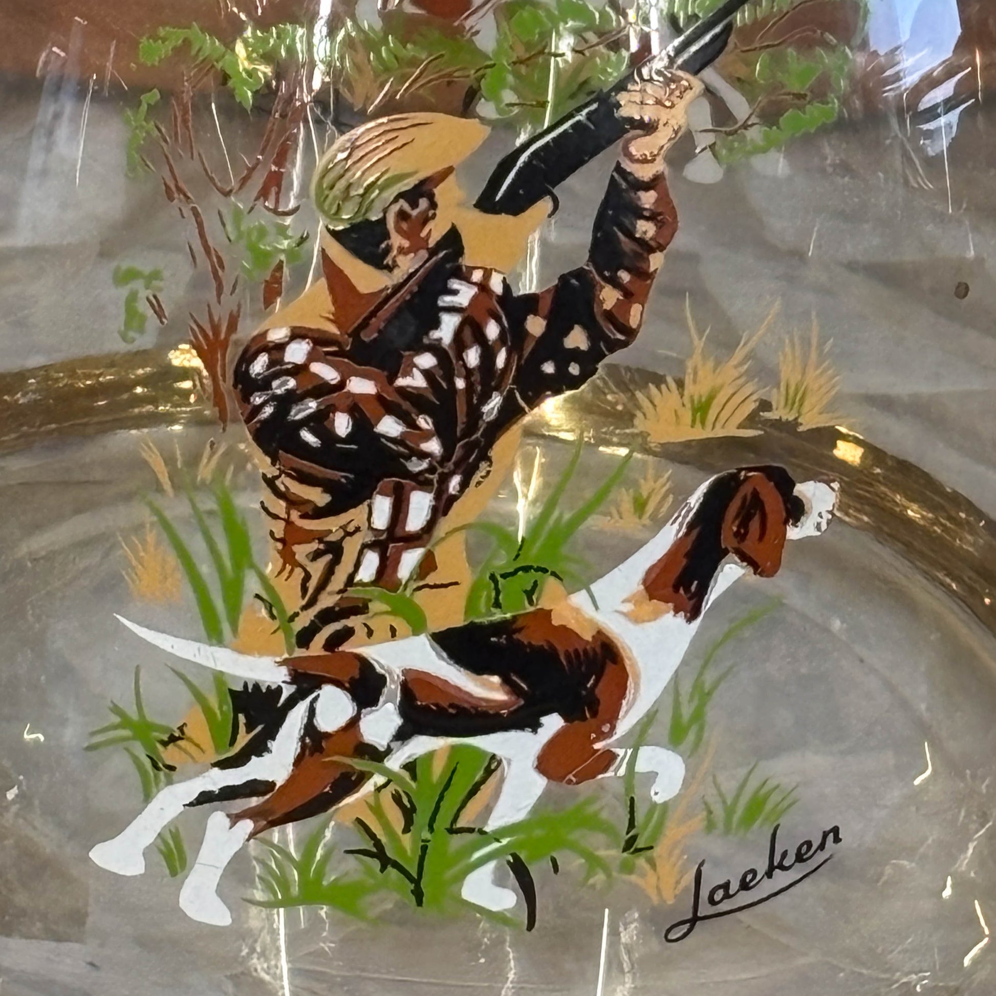 Jarra antigua de cristal con 4 vasos de la marca LAEKEN con motivos de caza.