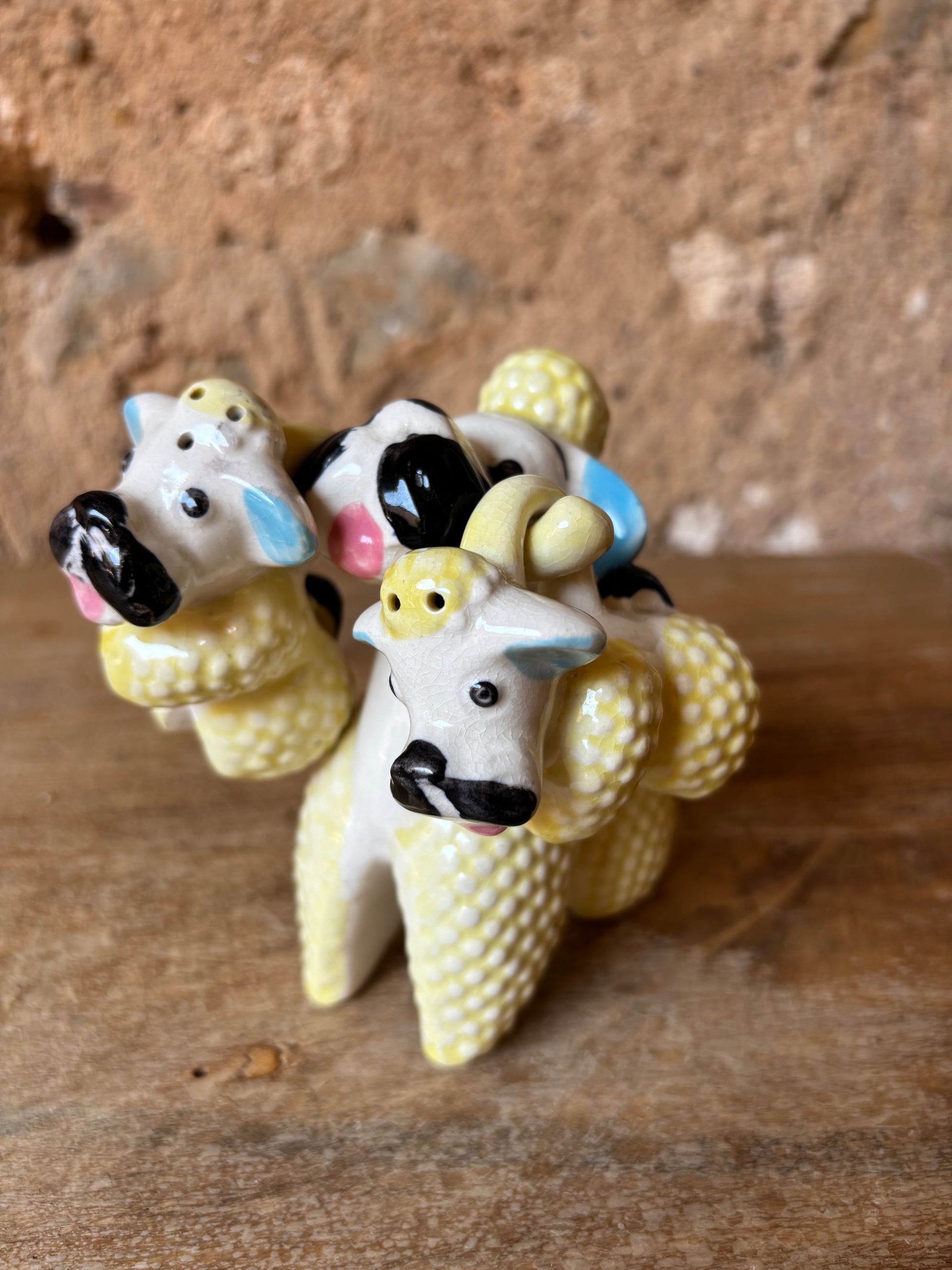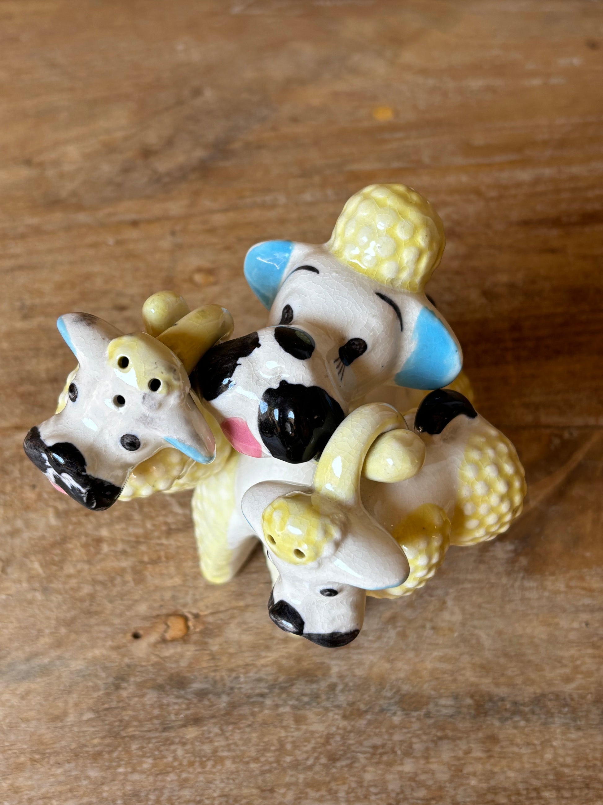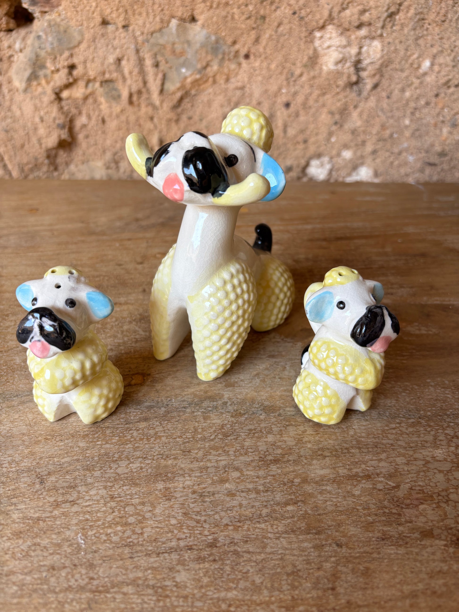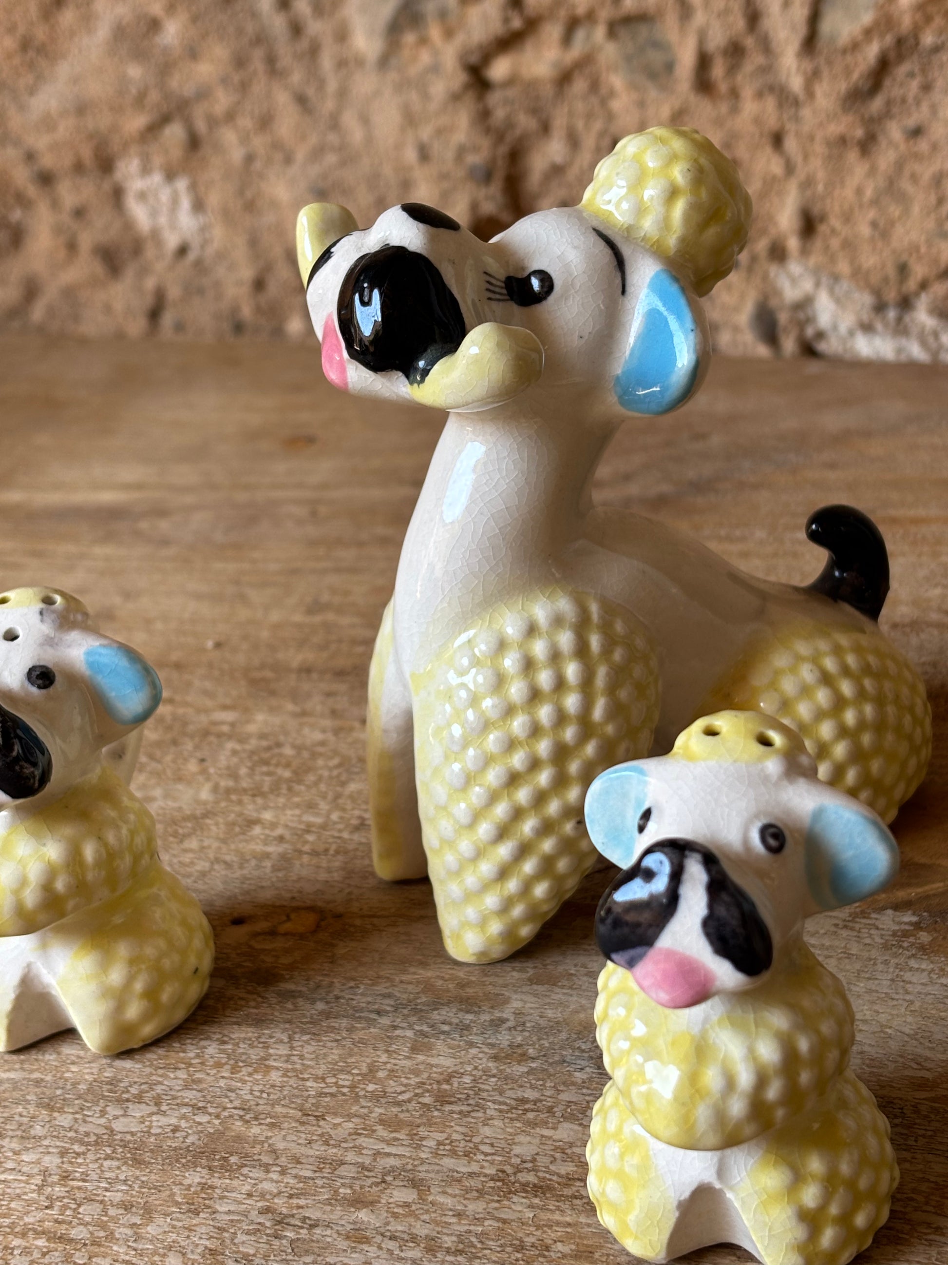 Conjunto retro kitsch vintage de salero y pimentero en forma de cachorros de caniche, sostenidos por su madre en cerámica esmaltada y pintado a mano.