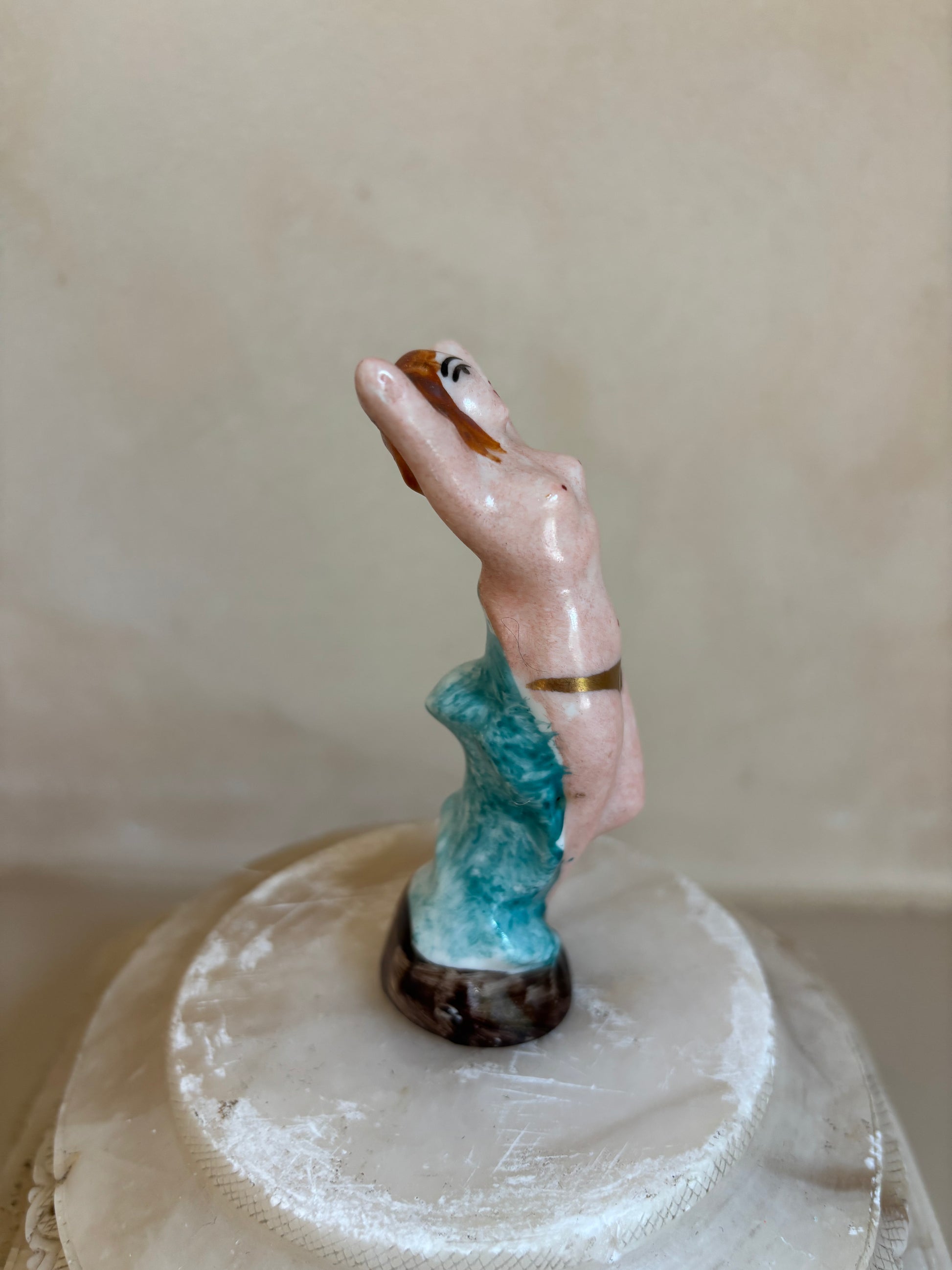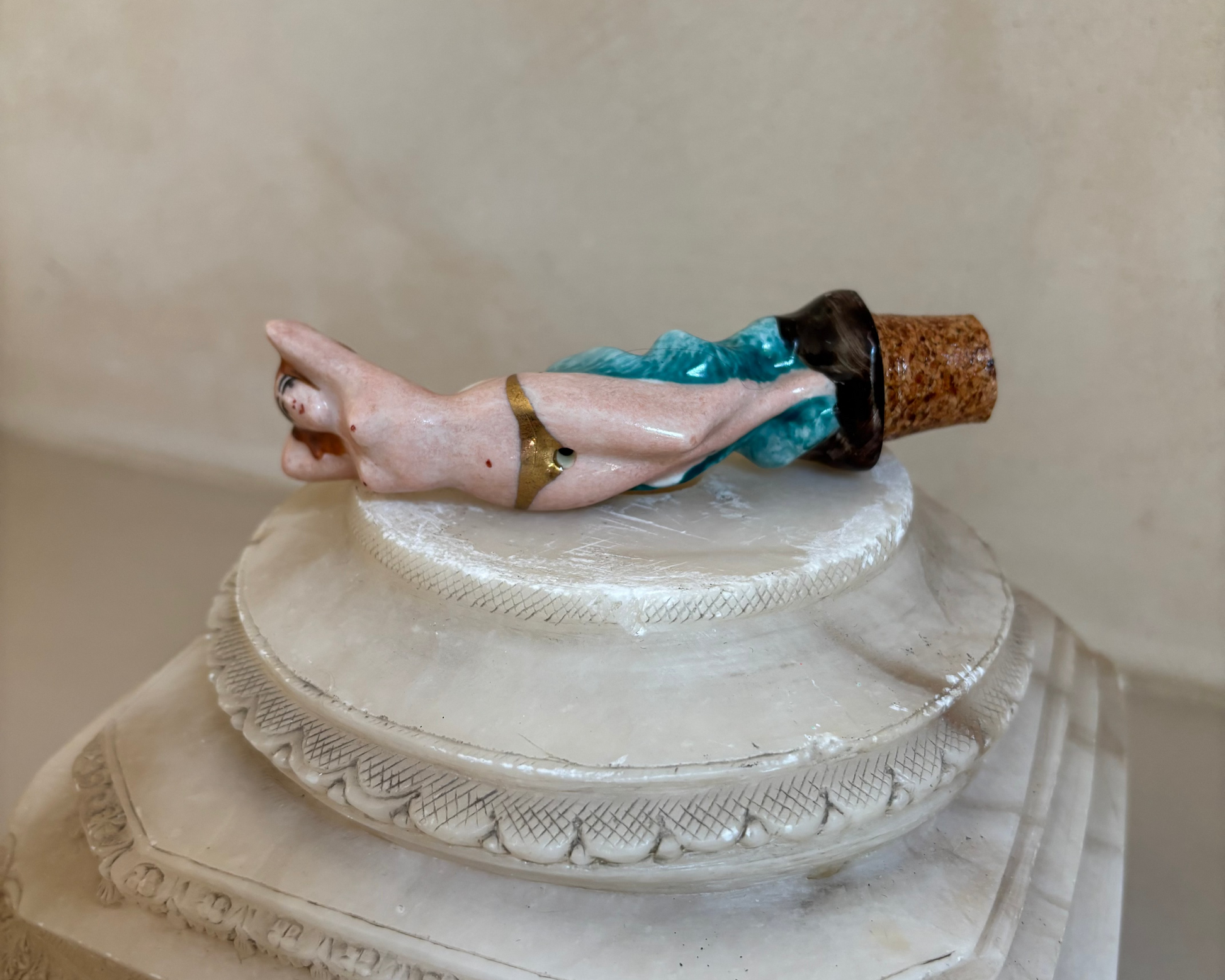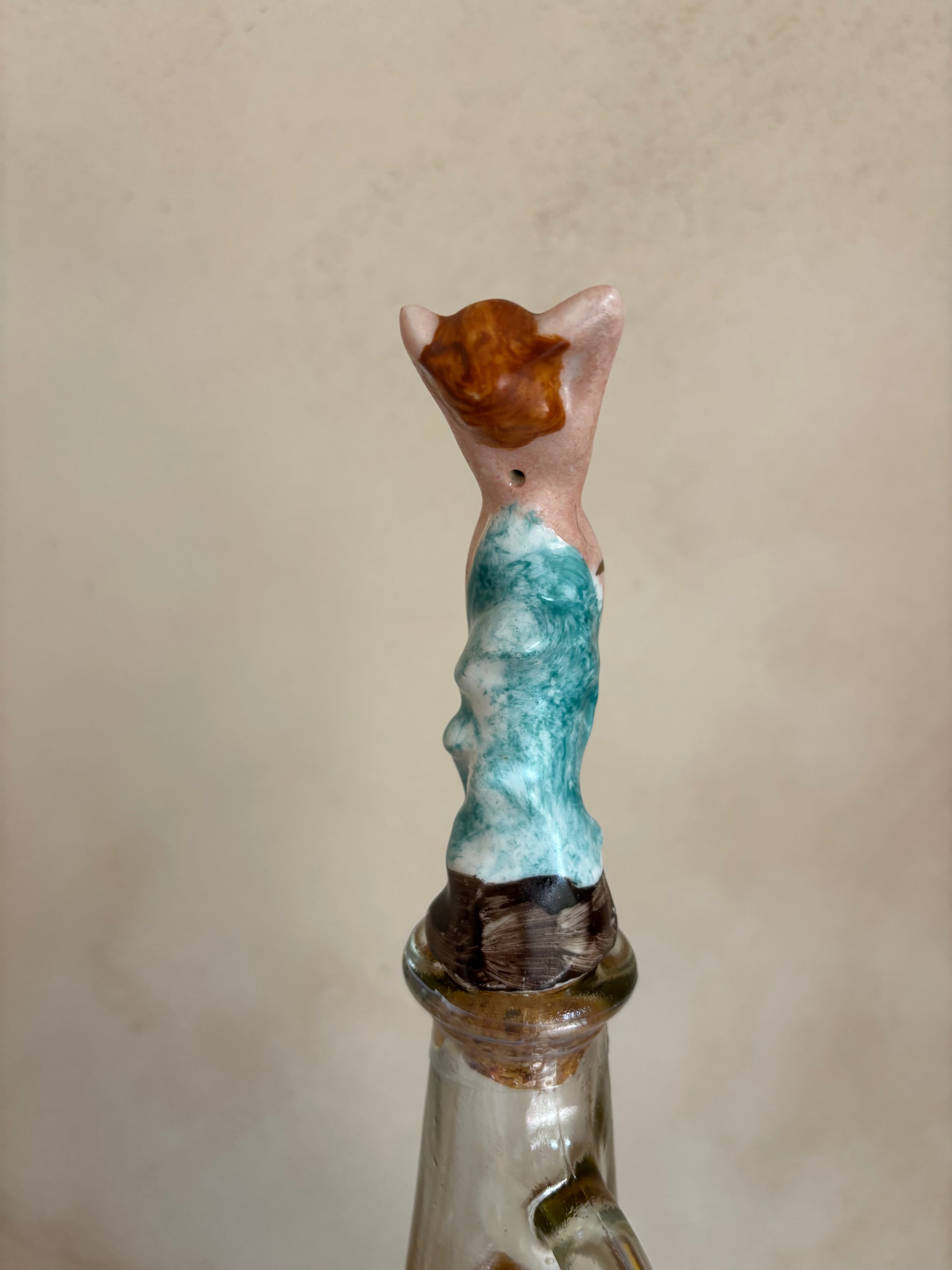 Dispensador años 40, para botella de aceite o vinagre con tapón de corcho y porcelana pintada a mano. Bailarina estilo Belle Époque.