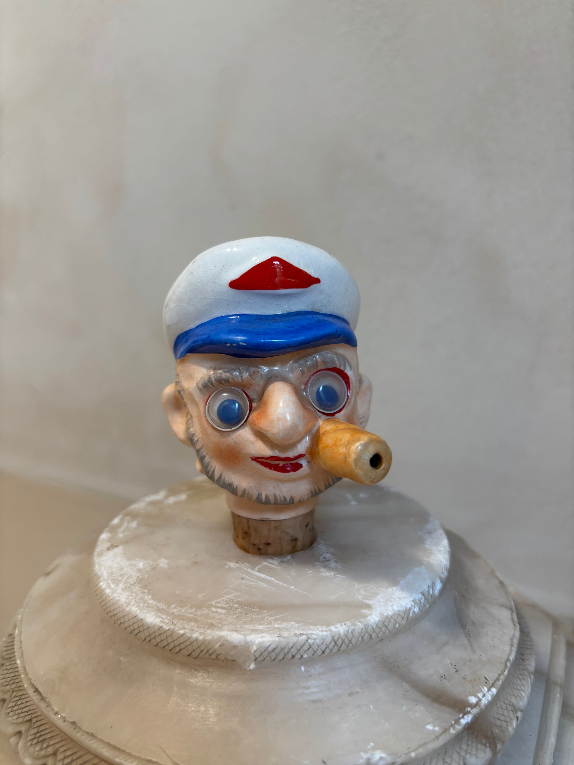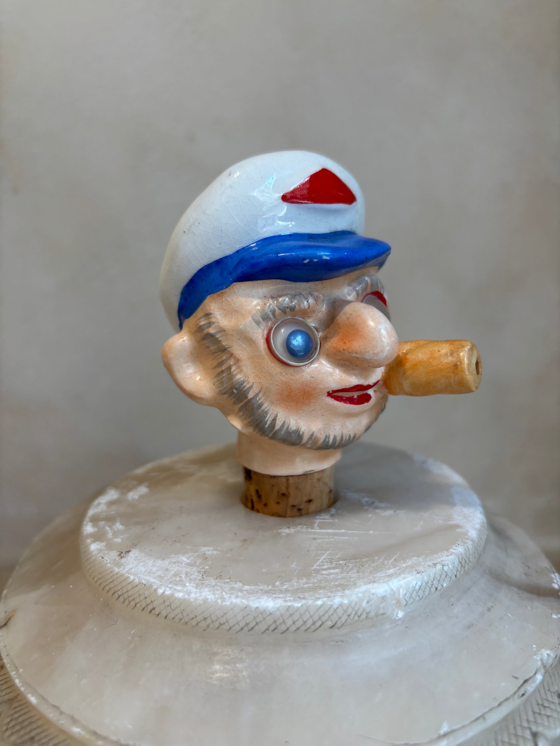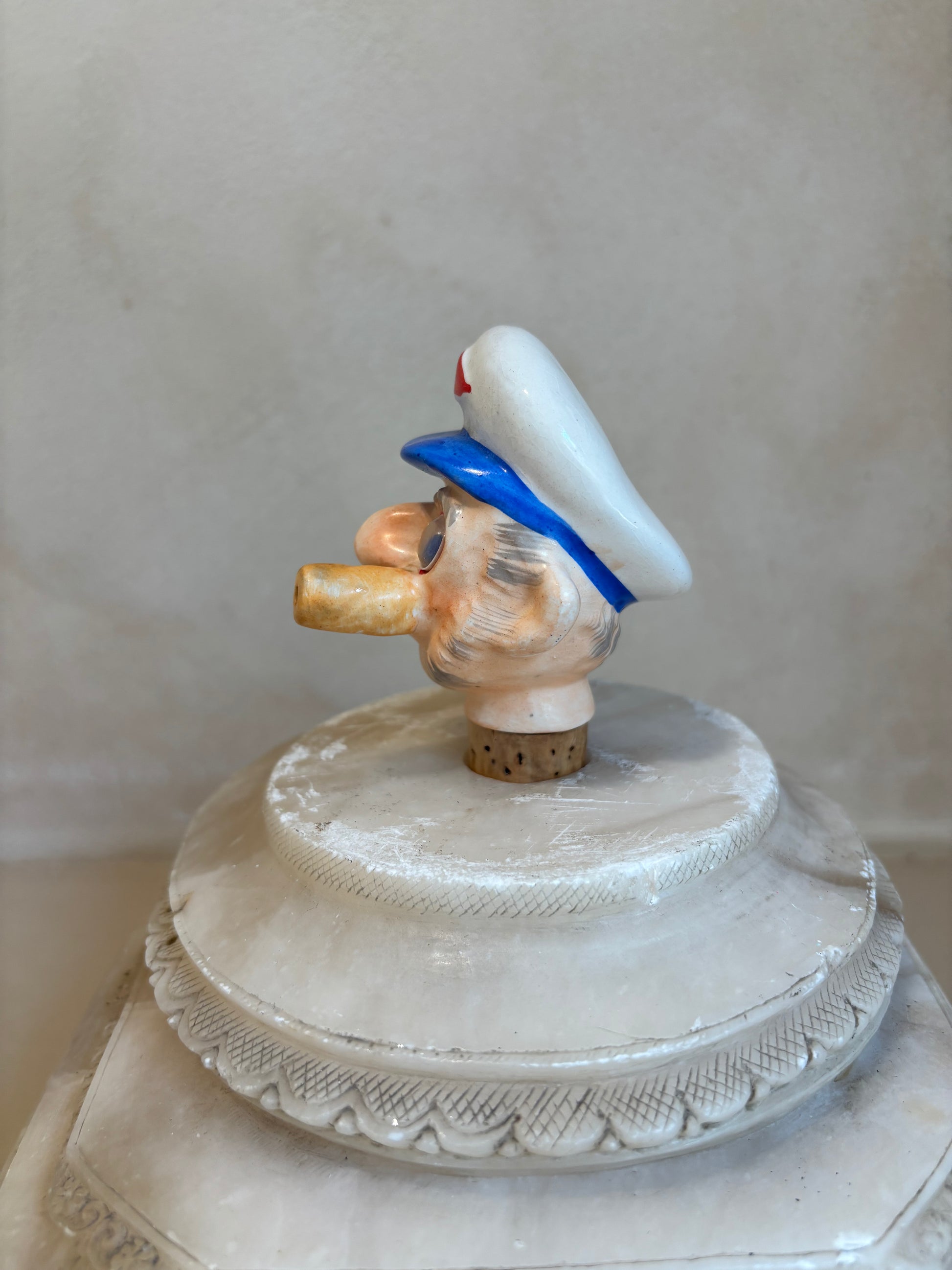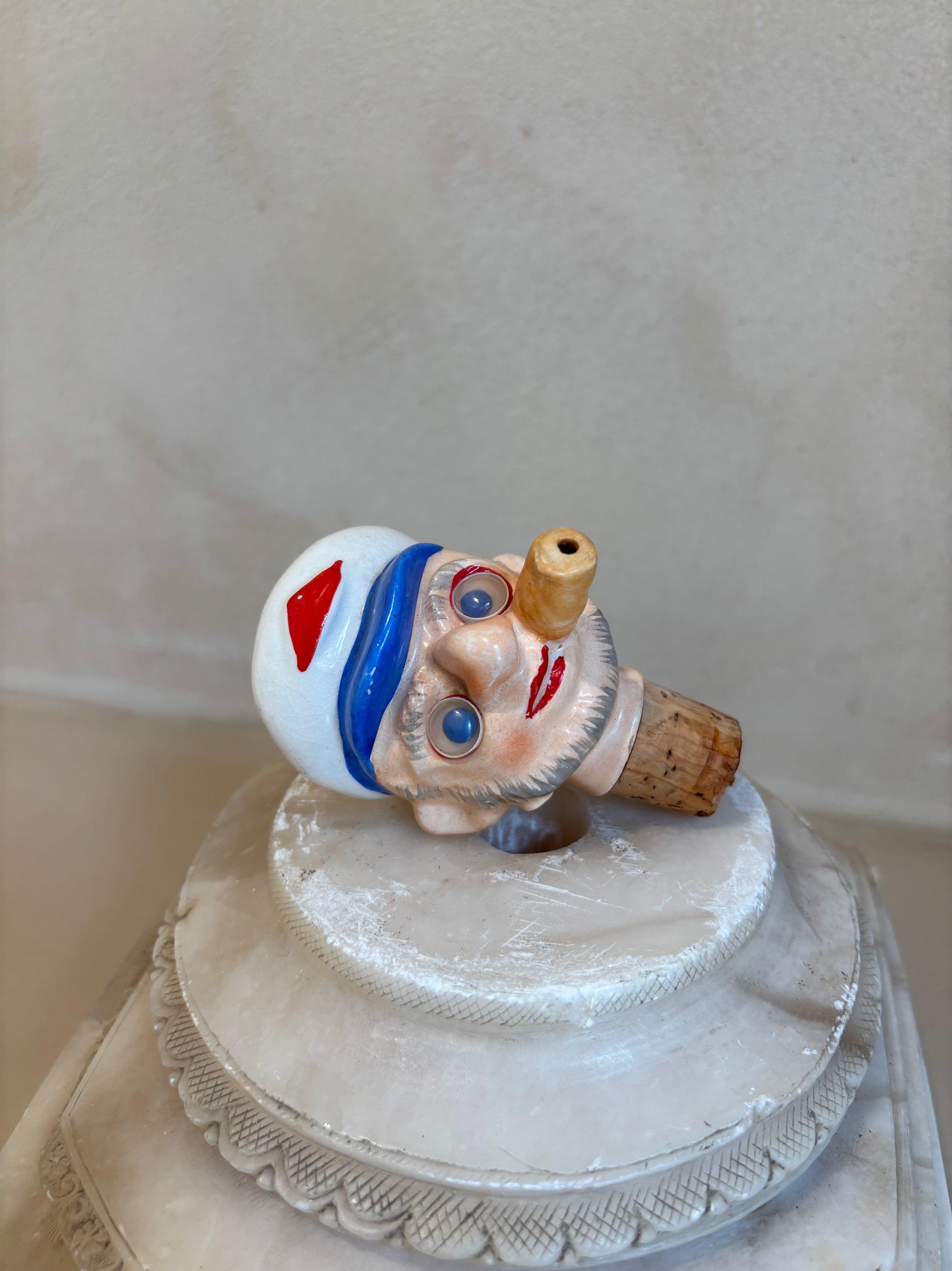 Dispensador vintage para botella de aceite o vinagre con tapón de corcho original, porcelana alemana en forma de busto marinero, ojos de plástico movibles originales de los años 60.
