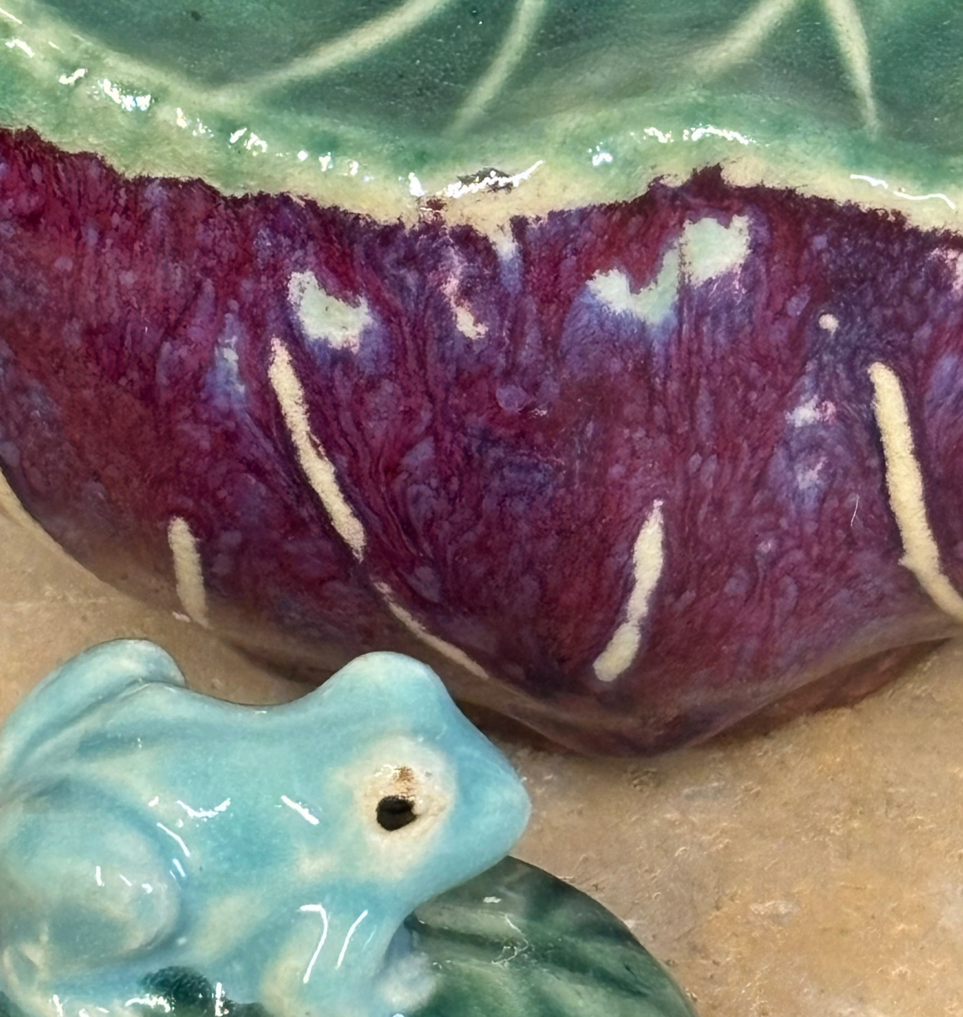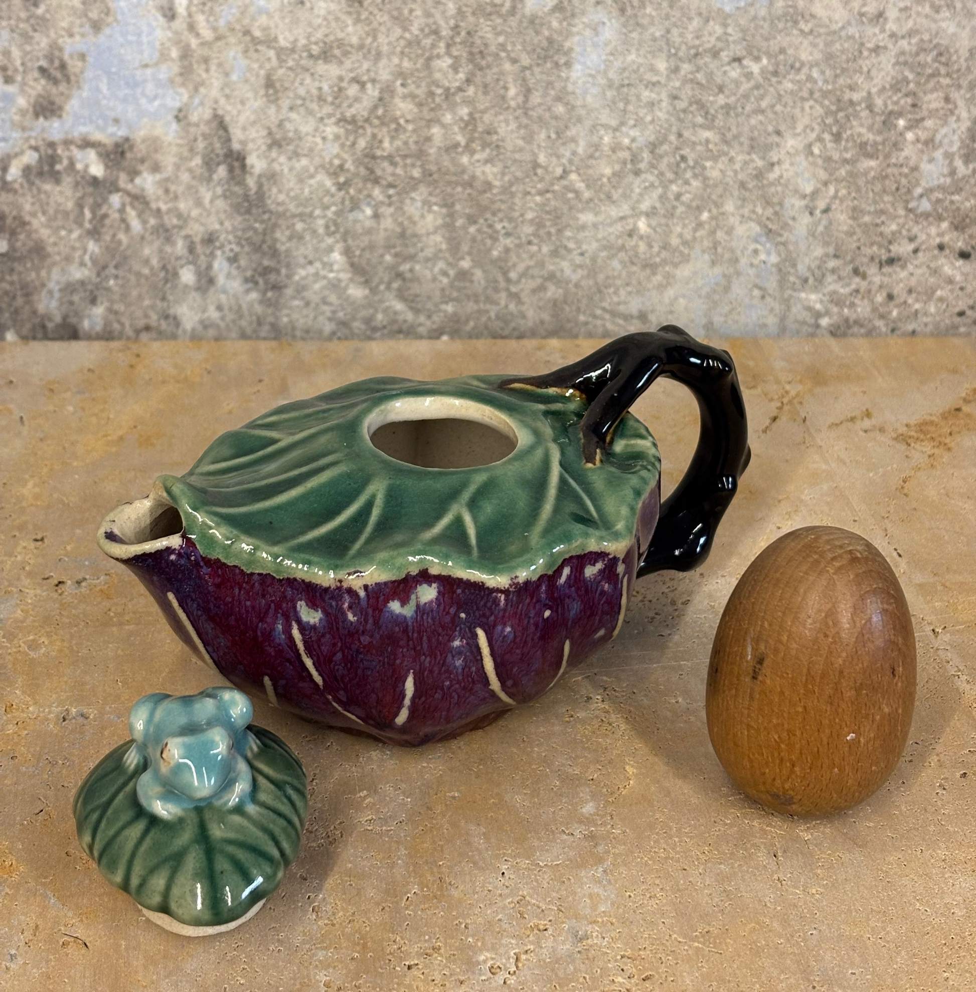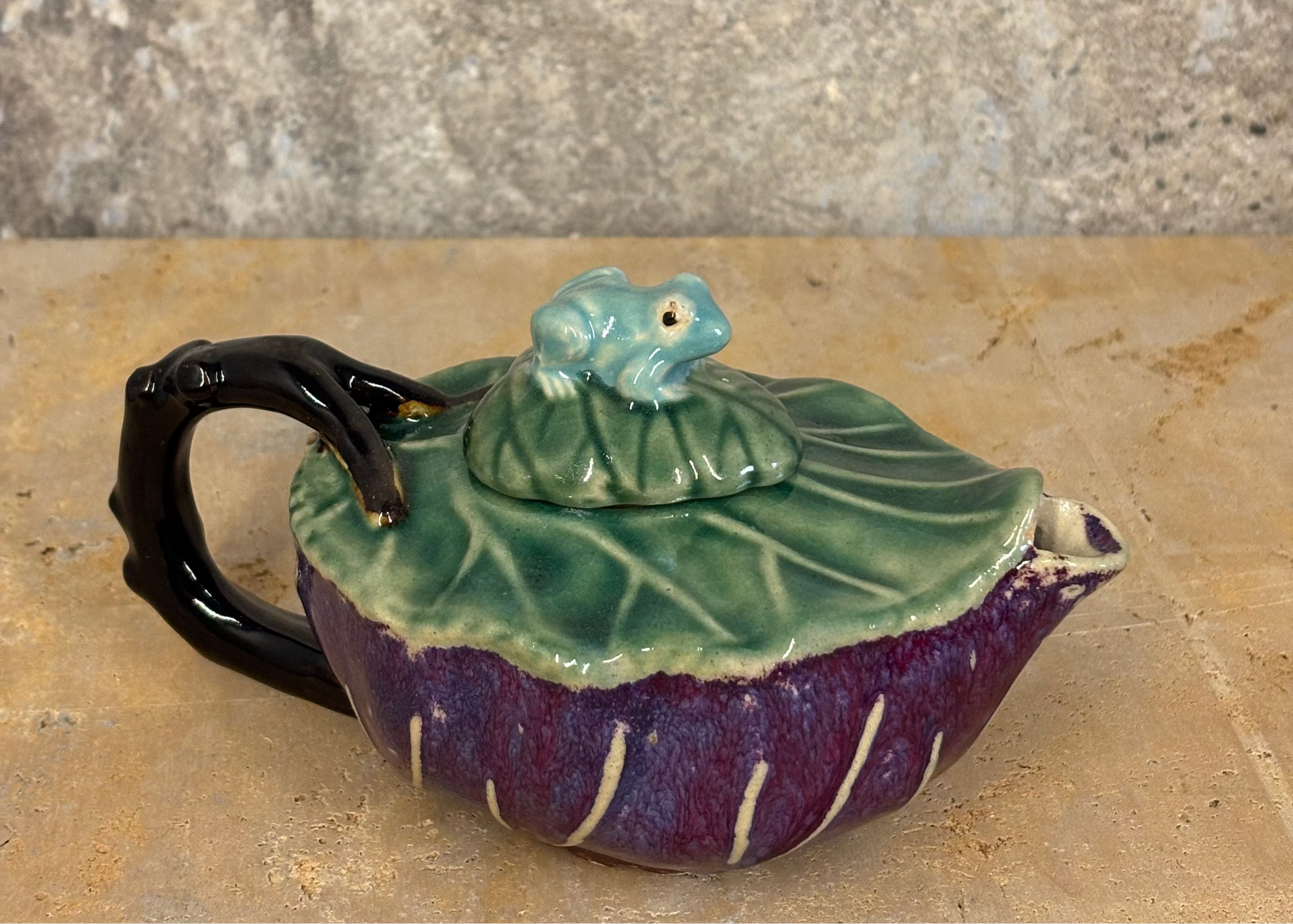 Tetera antigua en barbotine, esmaltada en color brillantes. Diseñada para tetera o salsera. Pieza firmada.